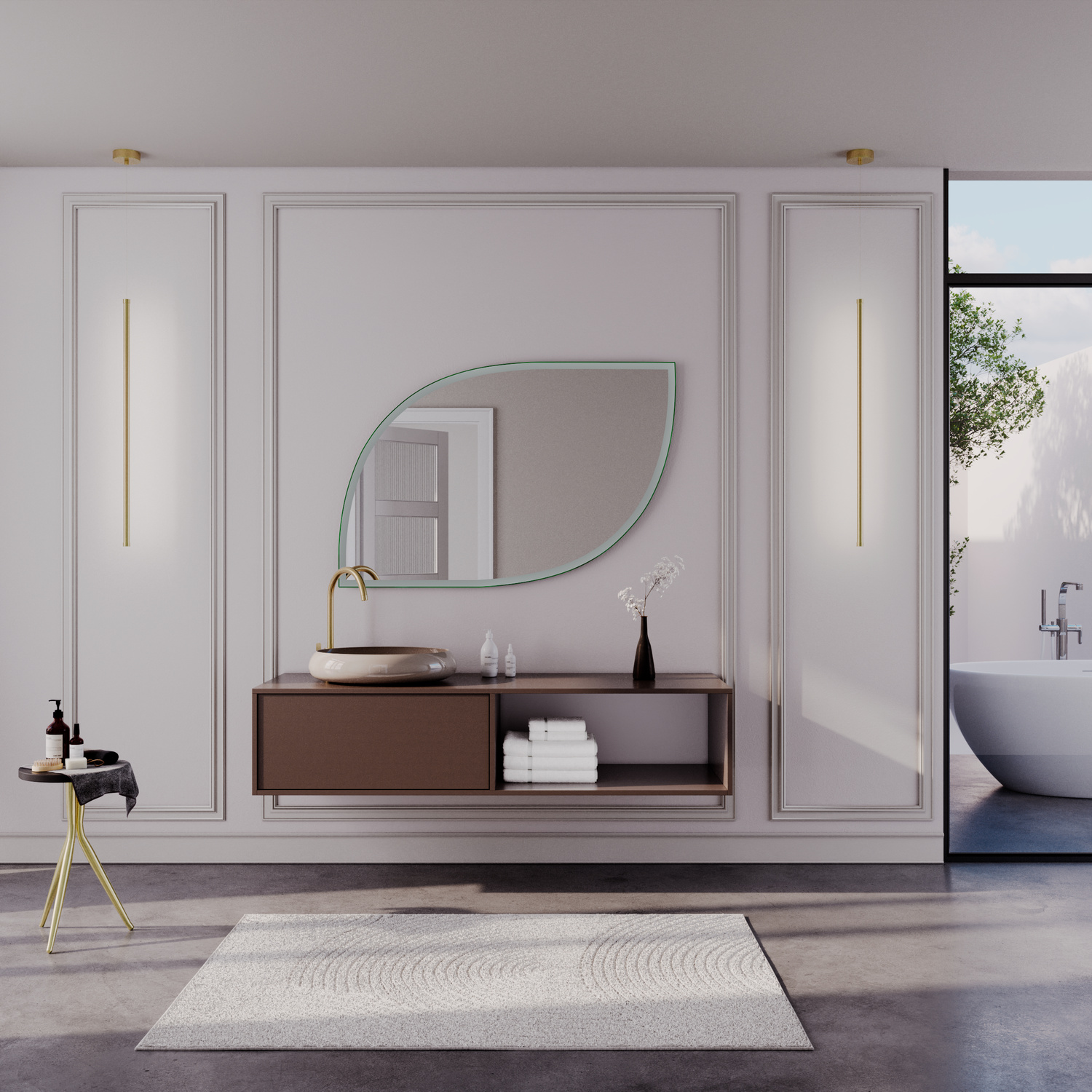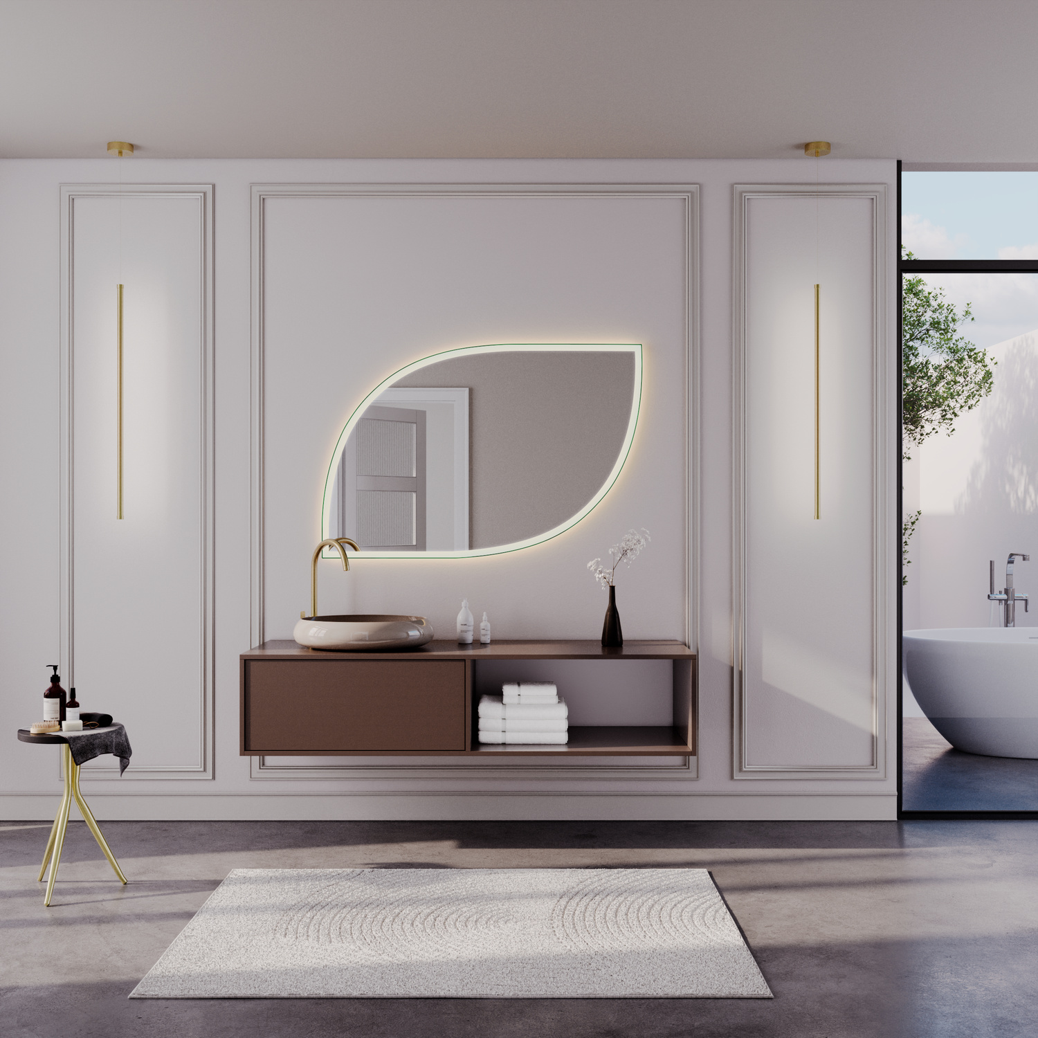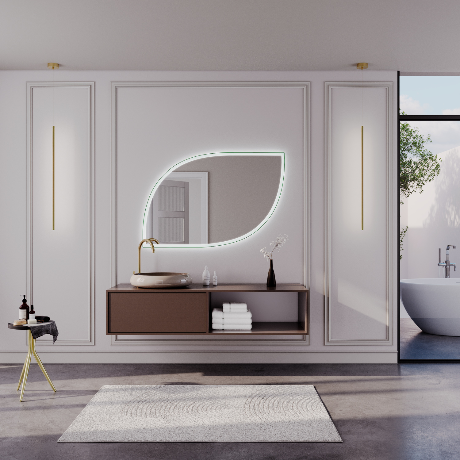 Die organische Silhouette bringt Bewegung in gerade Wandflächen und wirkt zugleich modern und leicht. Die LED-Ambientbeleuchtung setzt die Form des Spiegels gezielt in Szene und schafft eine angenehme Hintergrundbeleuchtung, die den Raum optisch abrundet, ohne zu blenden.