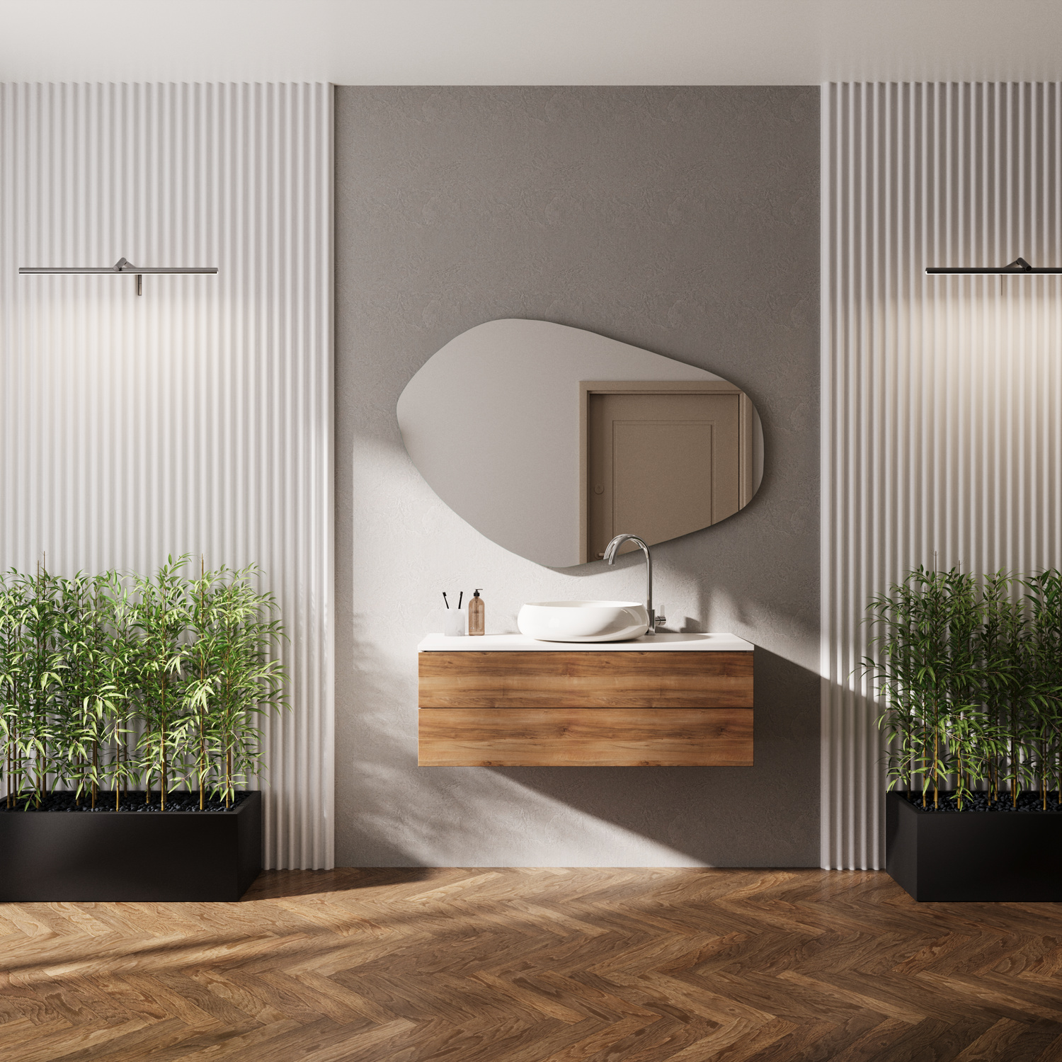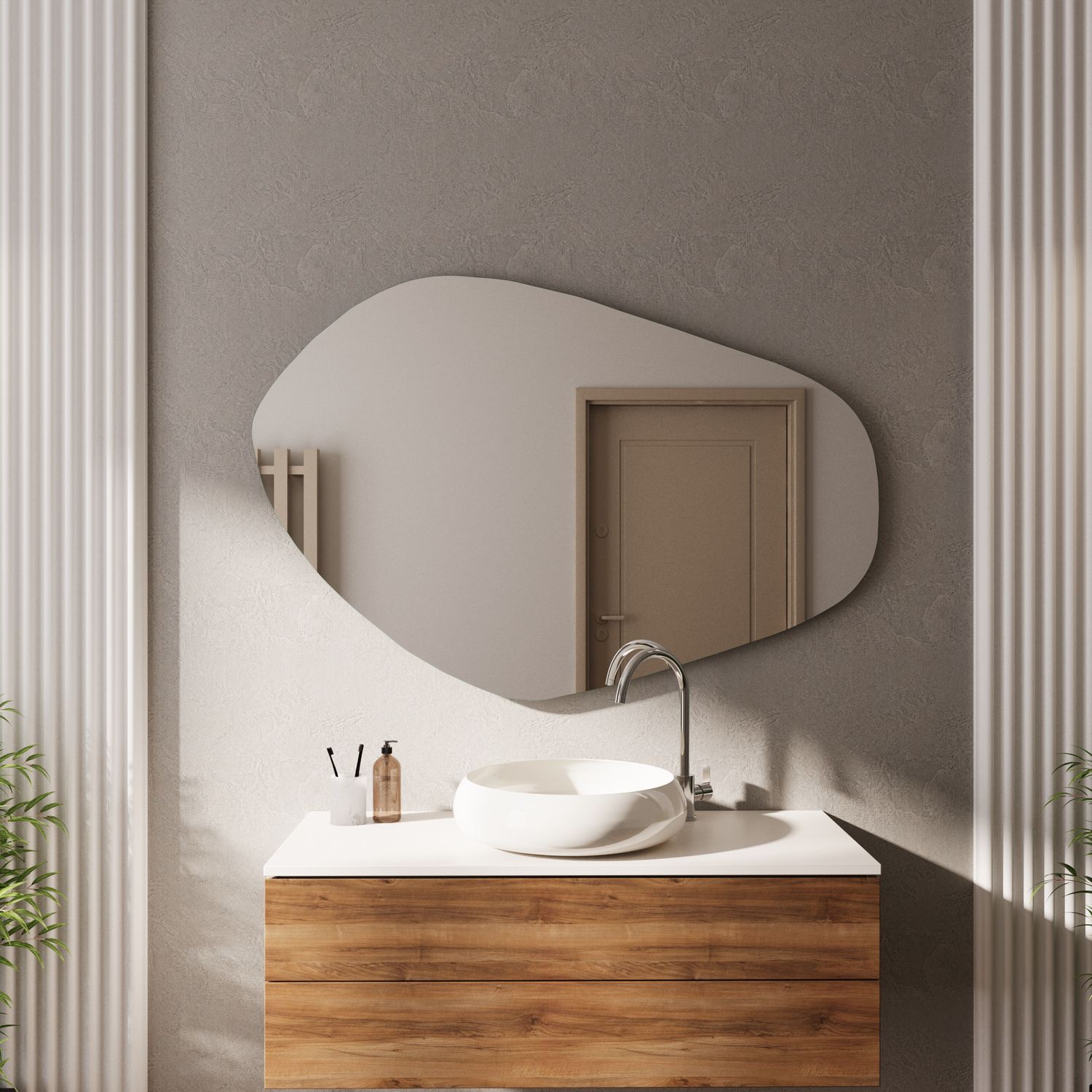 Die asymmetrische, nierenähnliche Silhouette sorgt für ein trendbewusstes Erscheinungsbild und hebt sich deutlich von klassischen Spiegelformen ab.