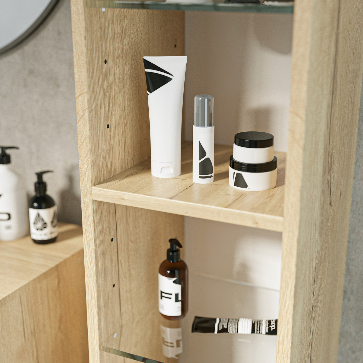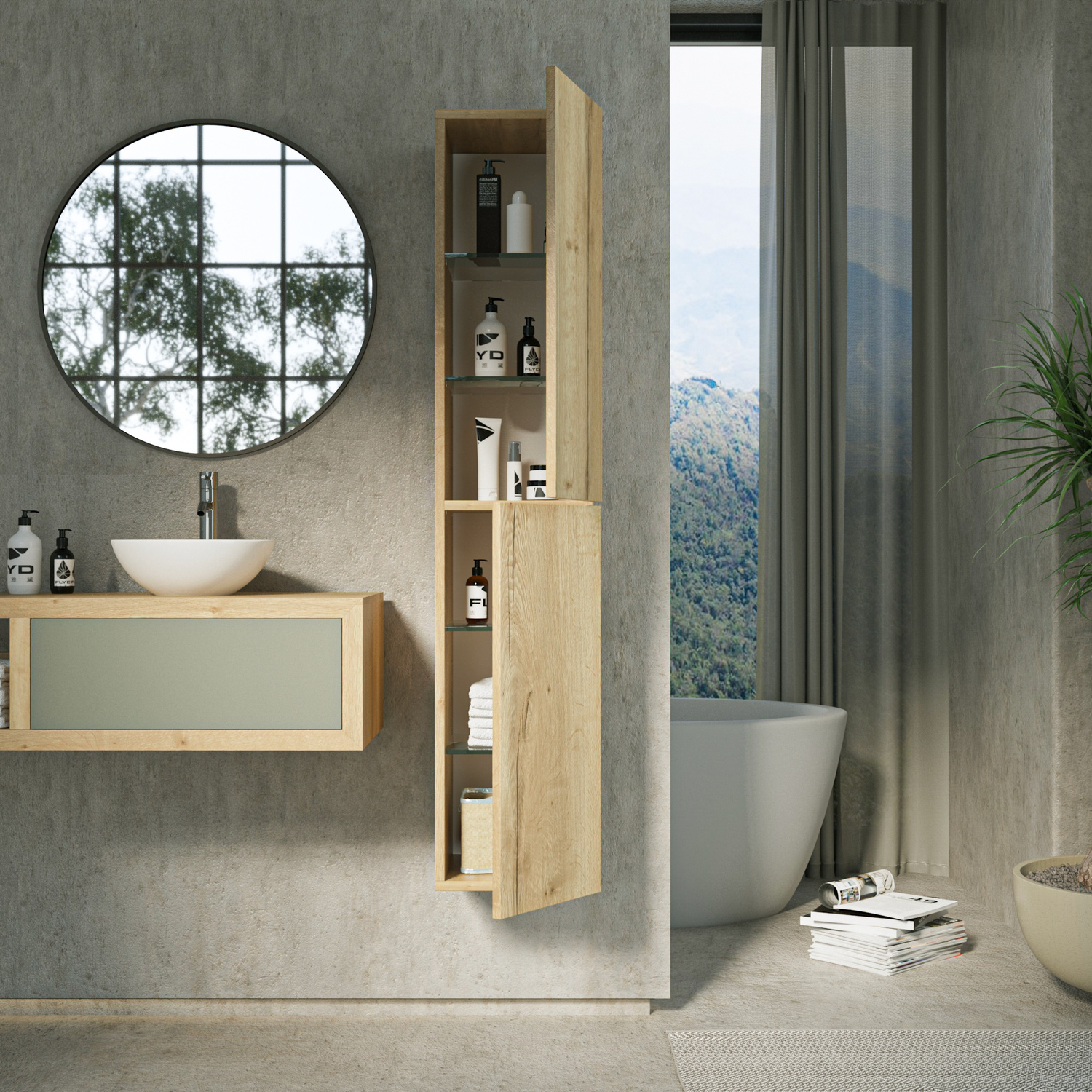Korpus und Türen bestehen aus 19 mm starken Egger-Dekorplatten – bekannt für ihre Stabilität, pflegeleichte Oberfläche und Feuchtigkeitsbeständigkeit. Die wasserfest verleimten Kanten schützen zuverlässig vor Aufquellen und gewährleisten, dass der Hochschrank auch in feuchten Badezimmern lange seine Form und Optik behält. Hochwertige Beschläge und leise Soft-Close-Türbänder sorgen für sanftes Schließen und unterstreichen den langlebigen Charakter des Möbels.