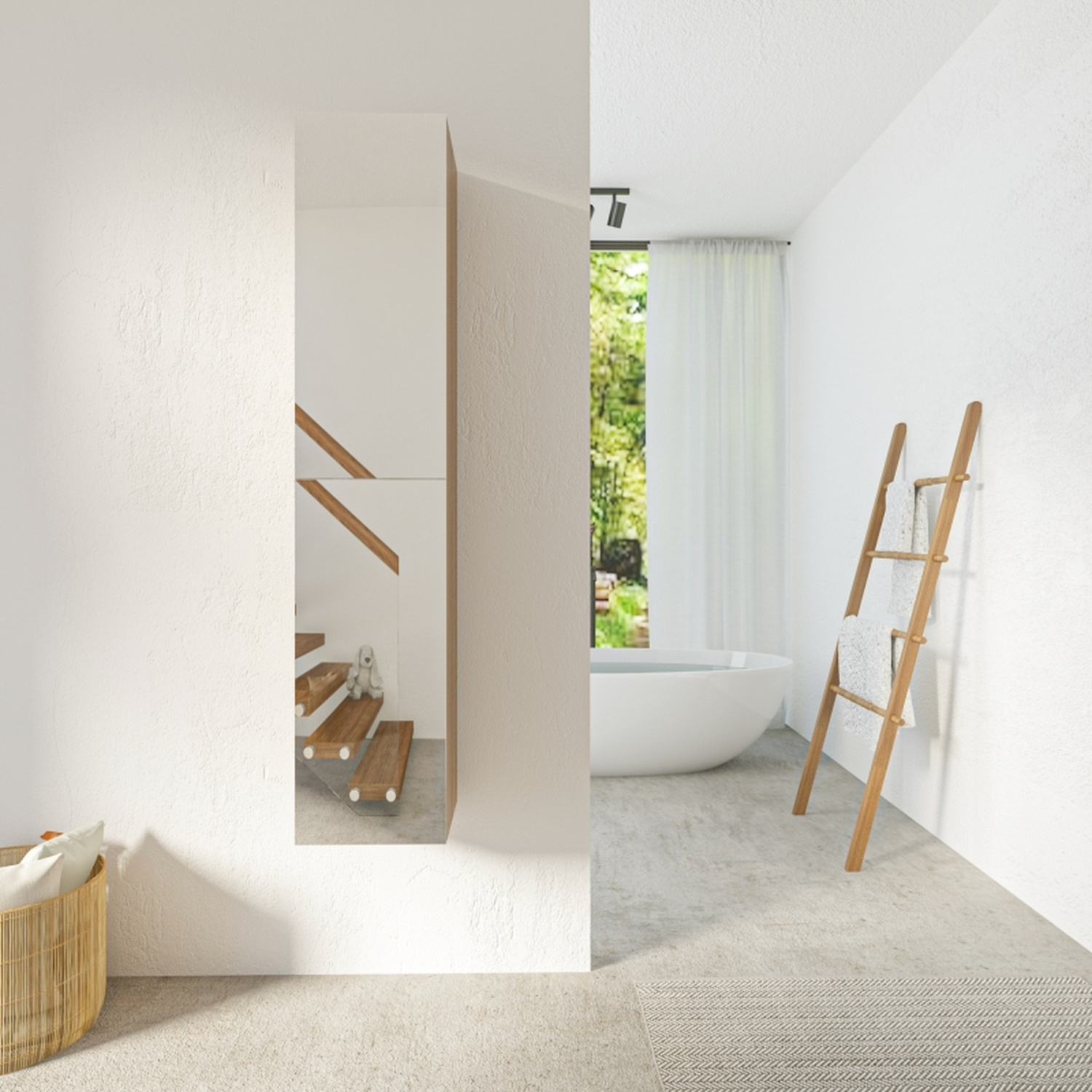 Korpus und Türen bestehen aus robusten, 19 mm starken Egger-Dekorplatten, die durch ihre wasserfeste Verleimung optimal für Feuchträume geeignet sind. Die Spiegeltüren sind flächenbündig montiert und bieten eine klare, verzerrungsfreie Reflexion. Dank hochwertiger Beschläge und leiser Soft-Close-Türbänder überzeugt der Hochschrank durch Langlebigkeit und angenehme Bedienung im Alltag.