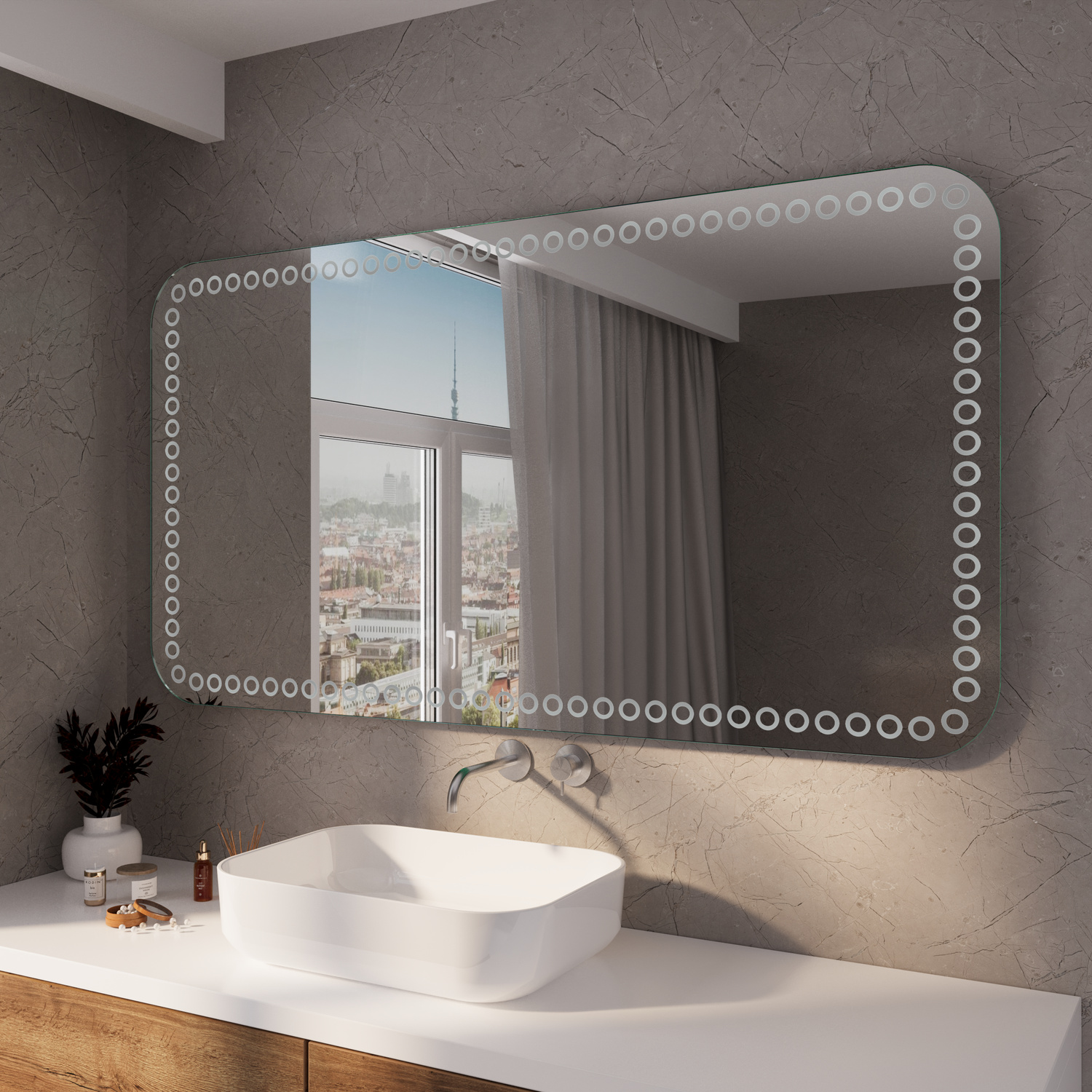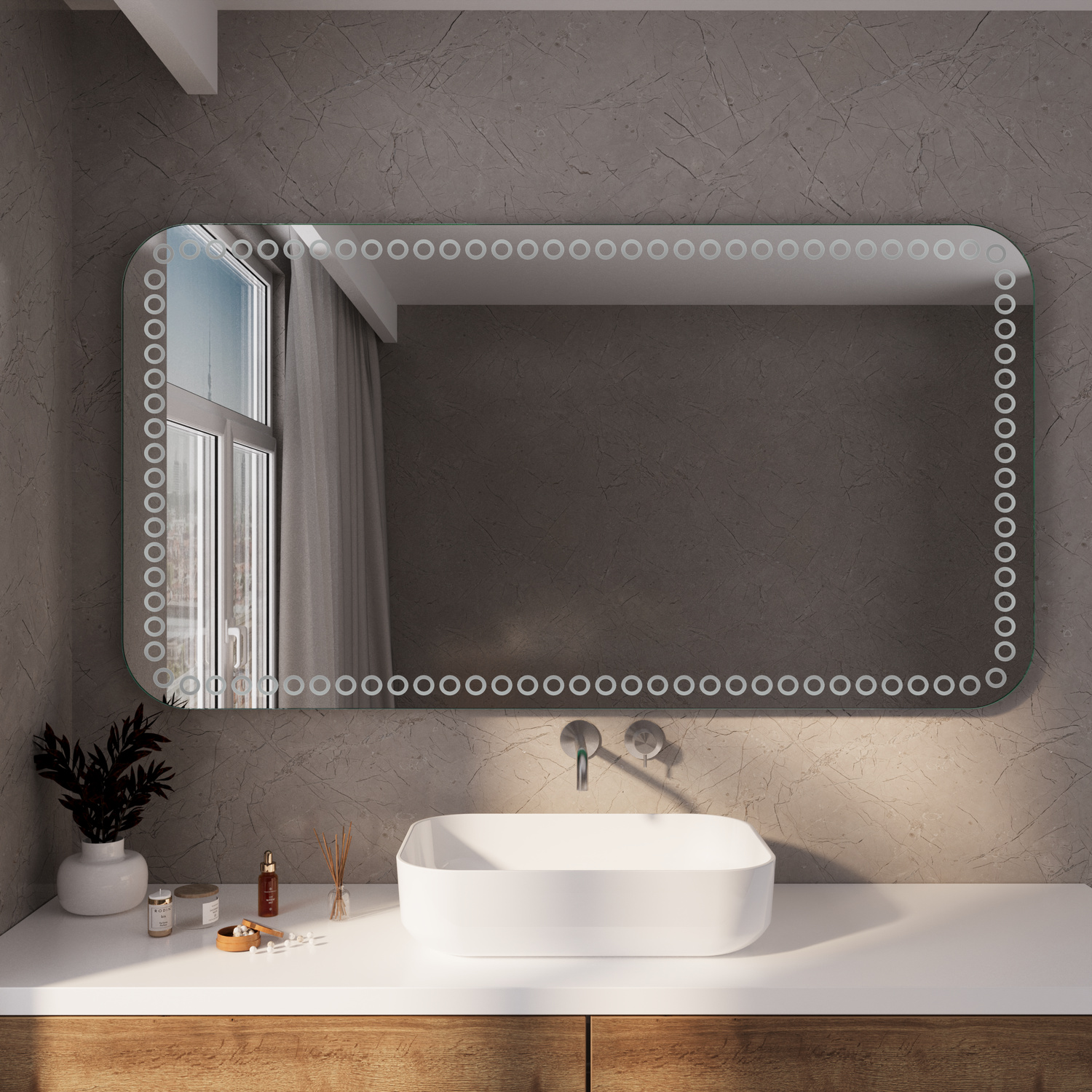 Der Badspiegel COGNAC RAD mit runden Ecken ist ein echtes Design-Highlight für Ihr Badezimmer. Mit seiner rundum verlaufenden, ca. 25 mm breiten satinierten Leuchtfläche im stilvollen Punktmuster sorgt er für ein raffiniertes Lichtspiel und eine luxuriöse Ausstrahlung. Die sanft abgerundeten Ecken verleihen dem Spiegel eine moderne, elegante Form, die sich harmonisch in jedes Raumkonzept einfügt.