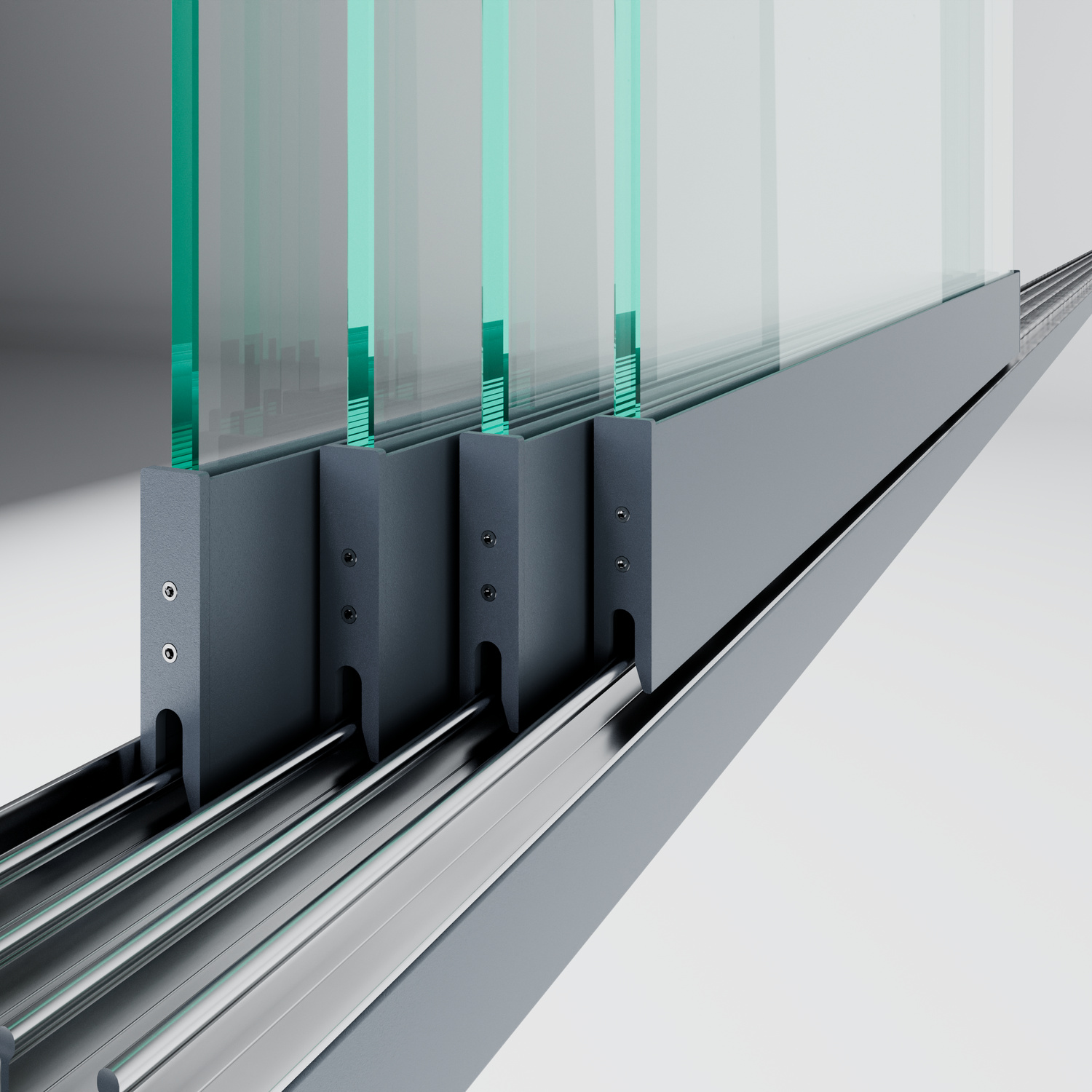 Das Herzstück bilden vier 10 mm starke ESG-Sicherheitsglasscheiben mit rundum polierten Kanten. Diese sorgen nicht nur für ein harmonisches Gesamtbild, sondern bieten auch höchste Stabilität und Schlagfestigkeit. Die Glaselemente laufen leichtgängig auf kugelgelagerten Laufrollen in einem hochwertigen Aluminium-Profilsystem, geführt auf vier separaten Schienen oben und unten. Dadurch lassen sich die Scheiben unabhängig voneinander bewegen – fließend, leise und präzise. Eine Überlappung von 30–50 mm zwischen den Elementen garantiert einen dichten Abschluss und schützt zuverlässig vor Zugluft und Spritzwasser.