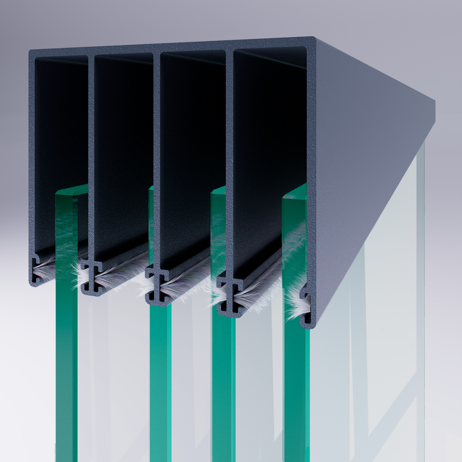 Die 10 mm starken ESG-Sicherheitsglasscheiben überzeugen durch Stabilität und optische Klarheit. Rundum polierte Kanten sorgen nicht nur für eine hochwertige Haptik, sondern auch für maximale Sicherheit im täglichen Gebrauch. Die vier Glaspaneele laufen ruhig und mühelos auf kugelgelagerten Laufrollen, eingebettet in ein präzise gefertigtes Aluminium-Profilsystem mit vier parallel geführten Schienen – oben und unten. Dank einer Überlappung von 30–50 mm schließen die Elemente harmonisch ineinander und bilden sowohl optisch als auch funktional eine durchdachte Einheit.