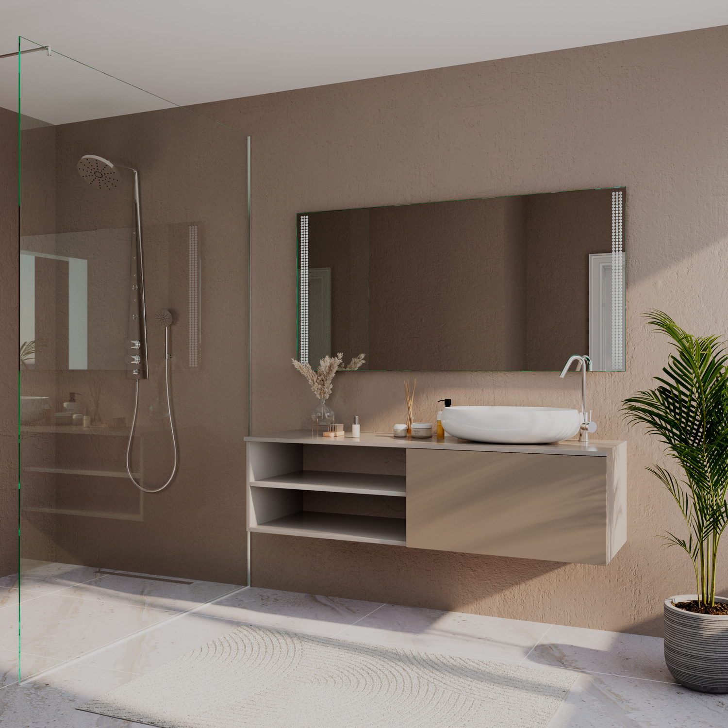 Der Badspiegel MENORCA ist ein eleganter Spiegel im modernen Digital-Design, der Funktionalität und Stil auf einzigartige Weise vereint. Gefertigt aus hochwertigem 6 mm Kristallglas, sorgt er für eine exzellente Lichtreflexion und verleiht Ihrem Badezimmer das mediterrane Flair Menorcas. Mit seiner außergewöhnlichen LED-Beleuchtung wird dieser Spiegel zum optischen Highlight und schafft eine stilvolle, warme Atmosphäre in jedem Raum.