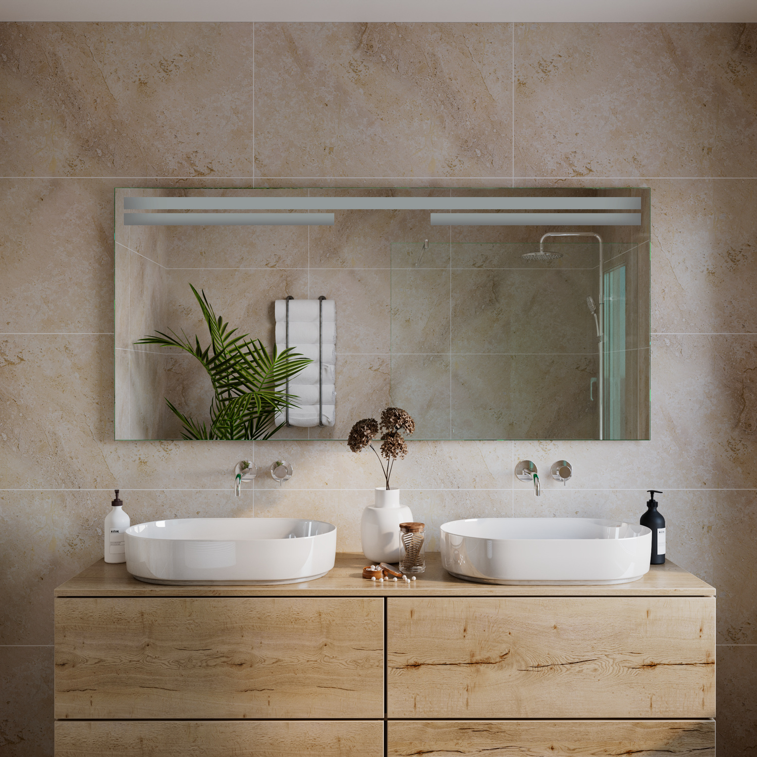 Der Badspiegel SALOU überzeugt durch sein modernes, elegantes Design und eine doppelte LED-Beleuchtung im oberen Bereich, die für einen eindrucksvollen Lichteffekt sorgt. Dieser exklusive Spiegel nach Maß eignet sich perfekt für großzügige Masterbäder ebenso wie für kleinere Gästebäder und setzt in jedem Raum ein stilvolles Statement.