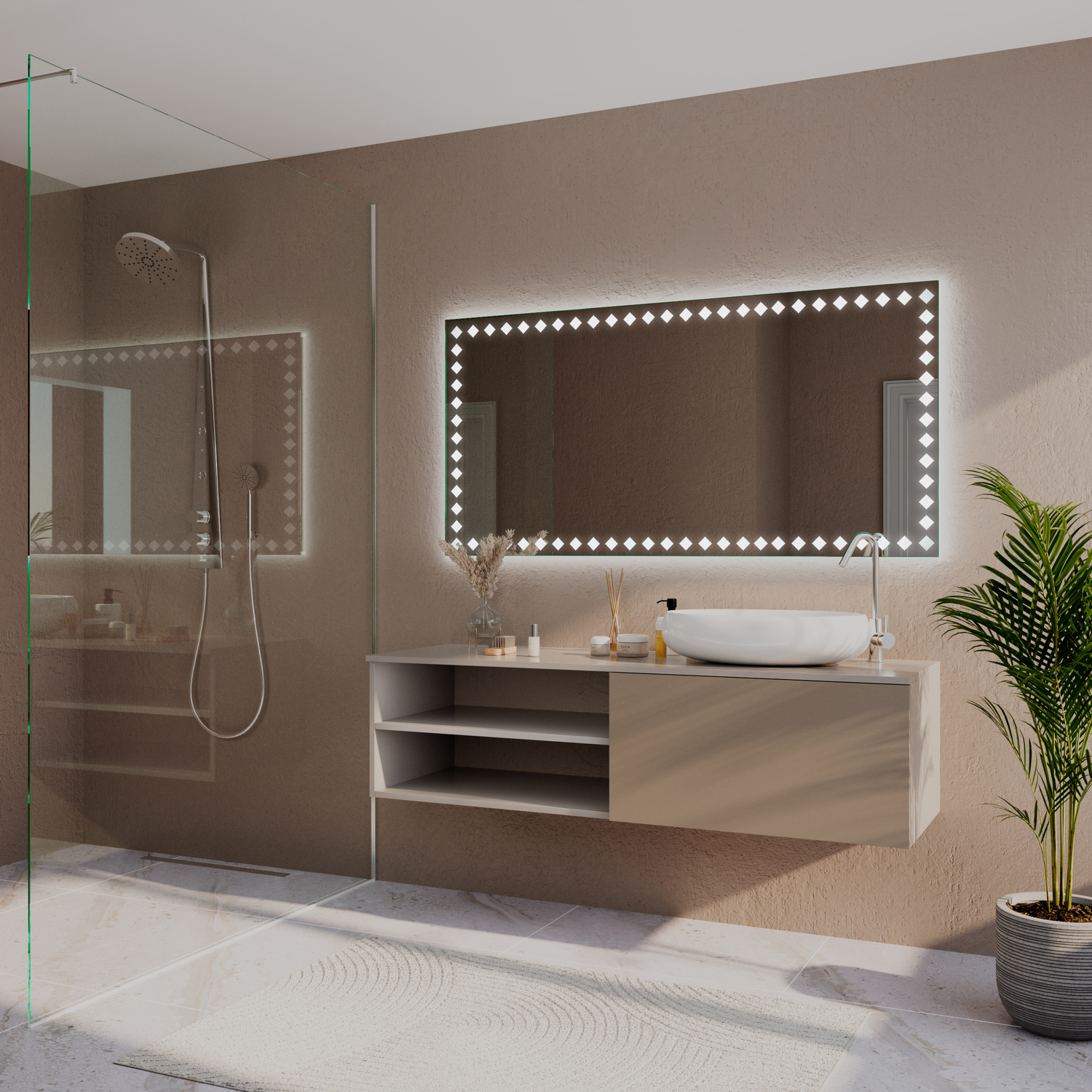 Der Badspiegel ARGENT ist ein moderner LED-Spiegel nach Maß mit umlaufender Lichtkante. Die klare, rahmenlose Optik fügt sich dezent in verschiedene Badstile ein und setzt gleichzeitig einen eleganten Akzent am Waschplatz.