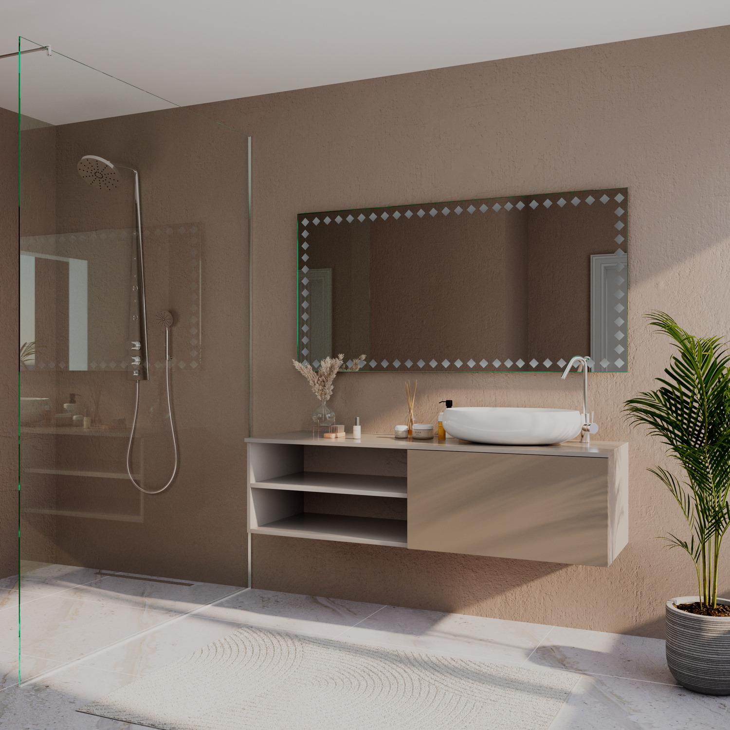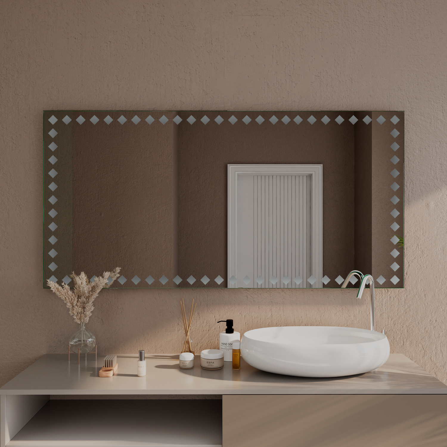 Durch die Maßanfertigung lässt sich der Spiegel exakt auf Waschtischbreite, Nischen oder Möbelprogramme abstimmen. So entsteht ein ruhiges, stimmiges Gesamtbild, das die Linien Ihres Badezimmers aufgreift und optisch erweitert, ohne überladen zu wirken.