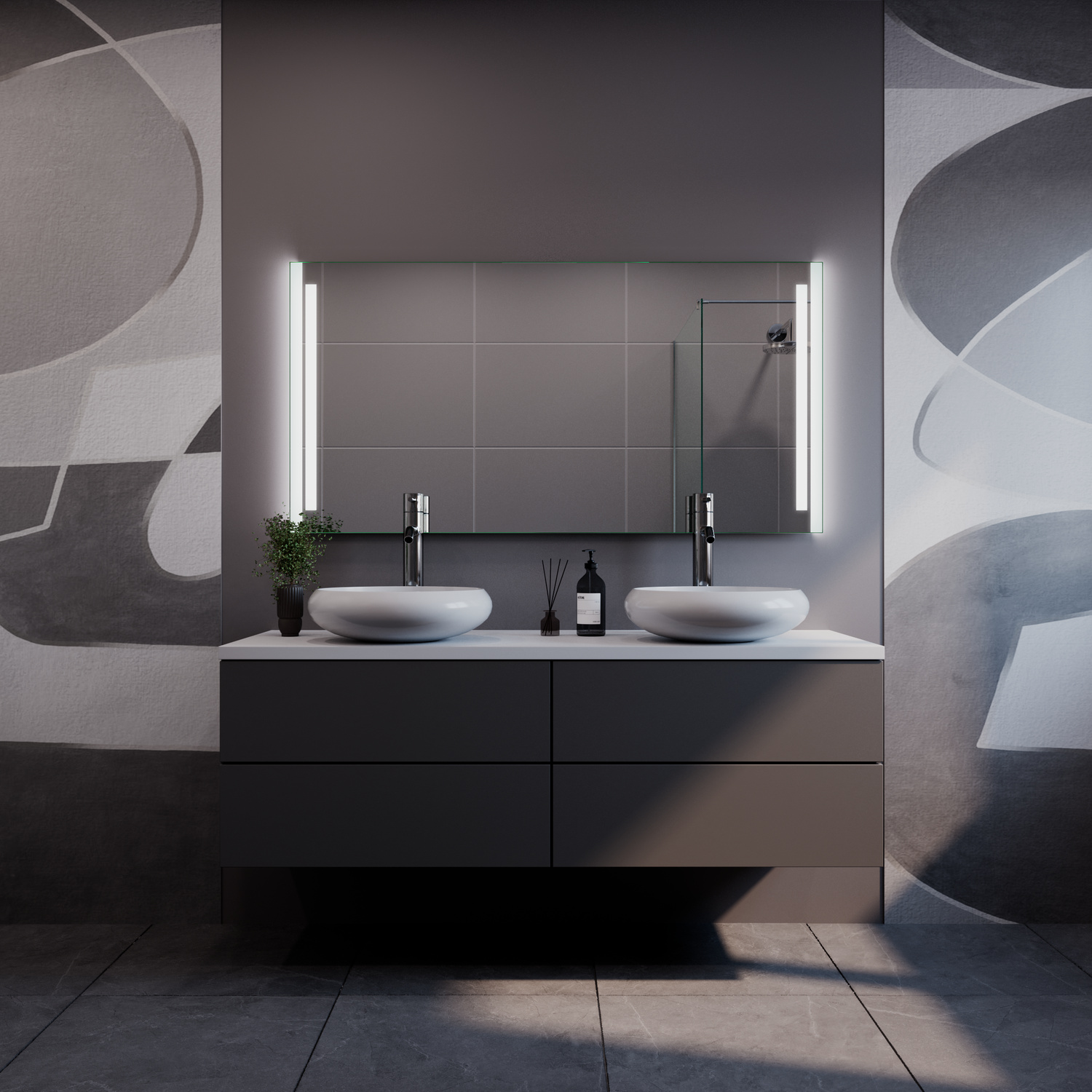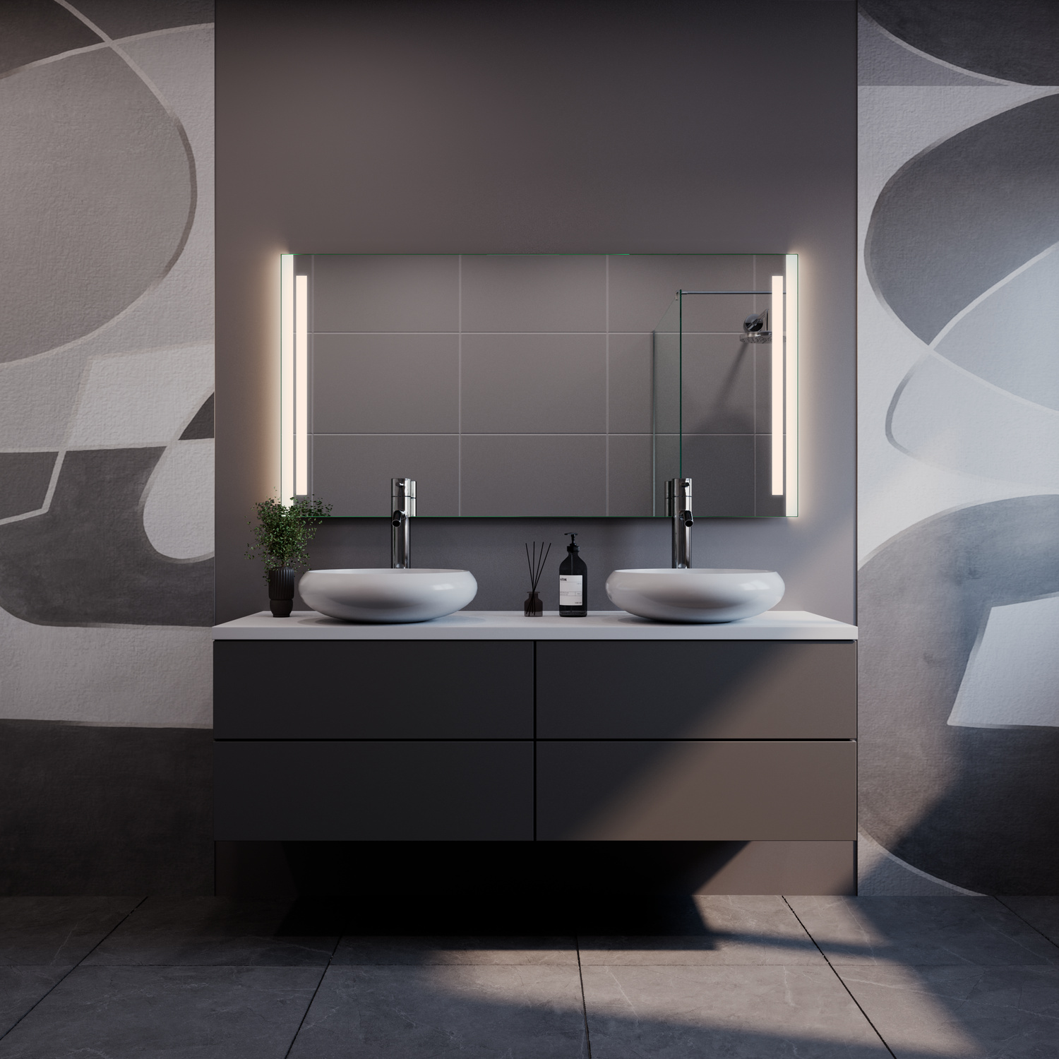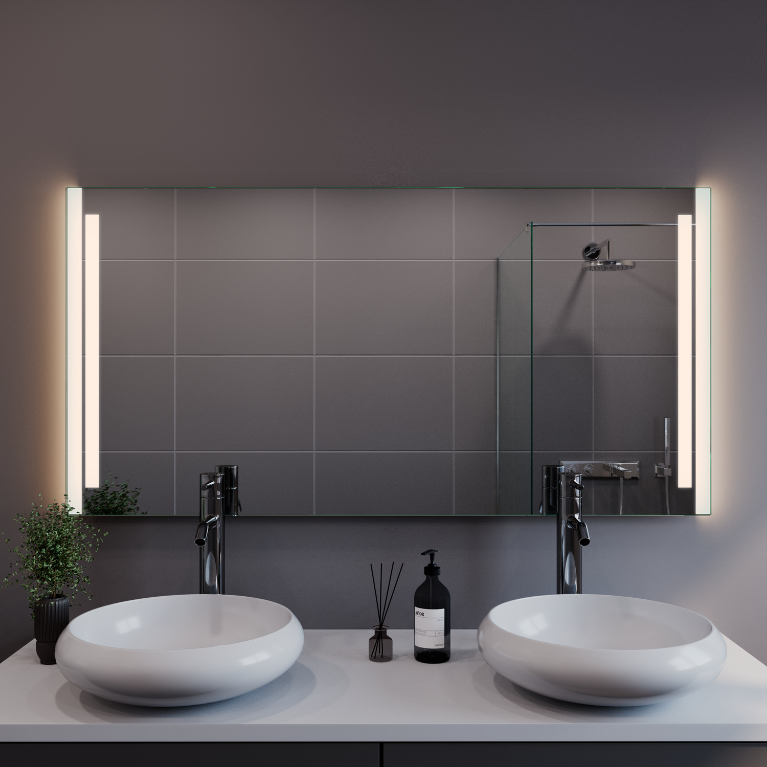 Der Badspiegel BARCELONA ist ein moderner LED-Spiegel mit seitlich integrierten, satinierten Leuchtflächen. Die links und rechts angeordneten Lichtzonen sorgen für eine gleichmäßige Ausleuchtung und unterstützen eine angenehme, ruhige Lichtwirkung im Badezimmer.