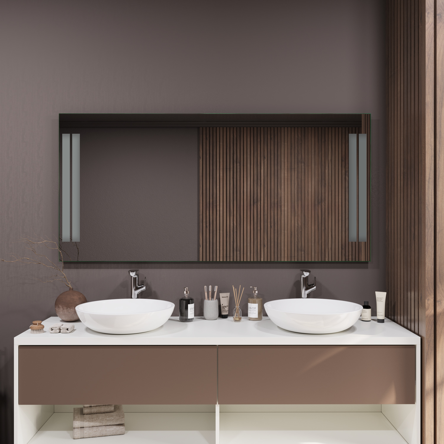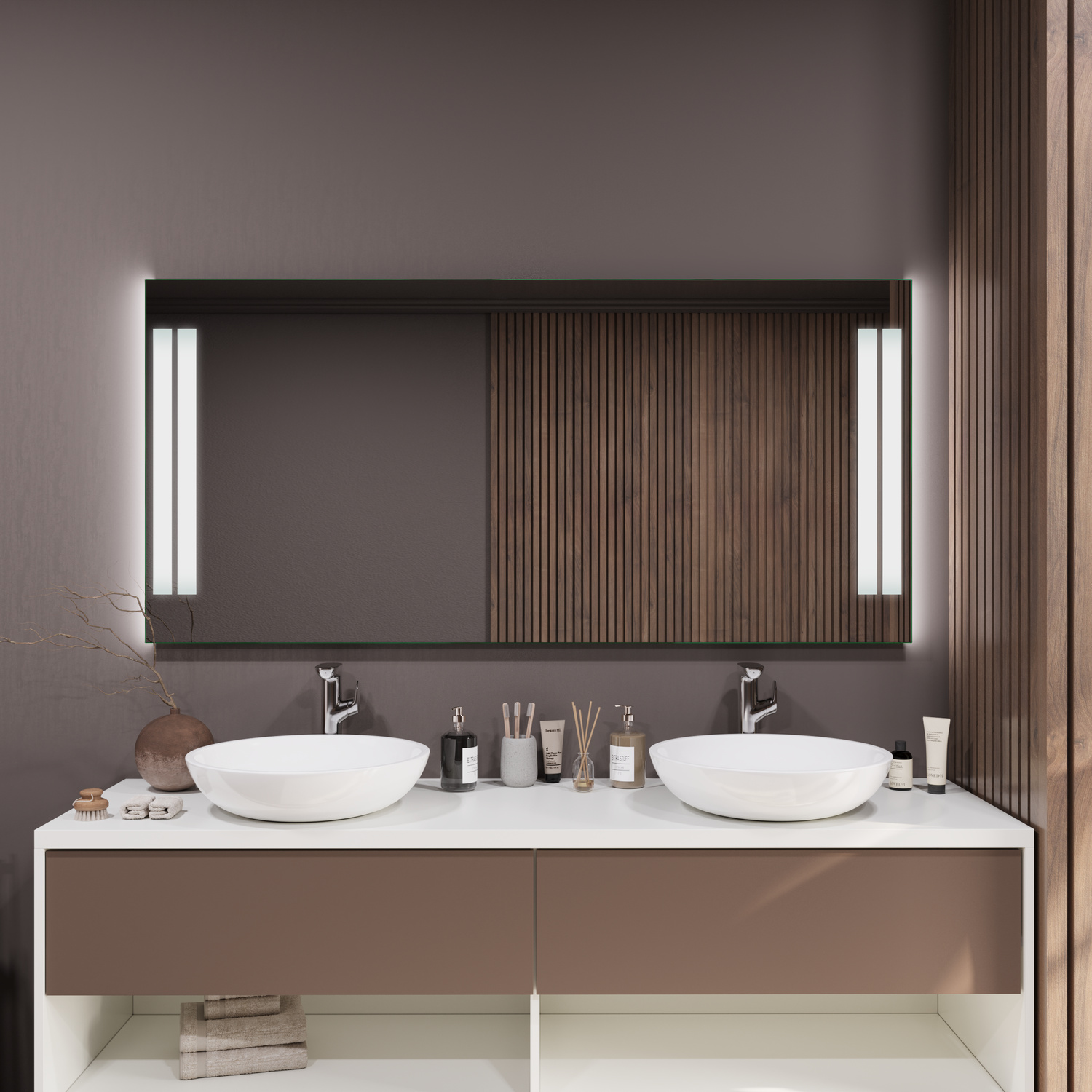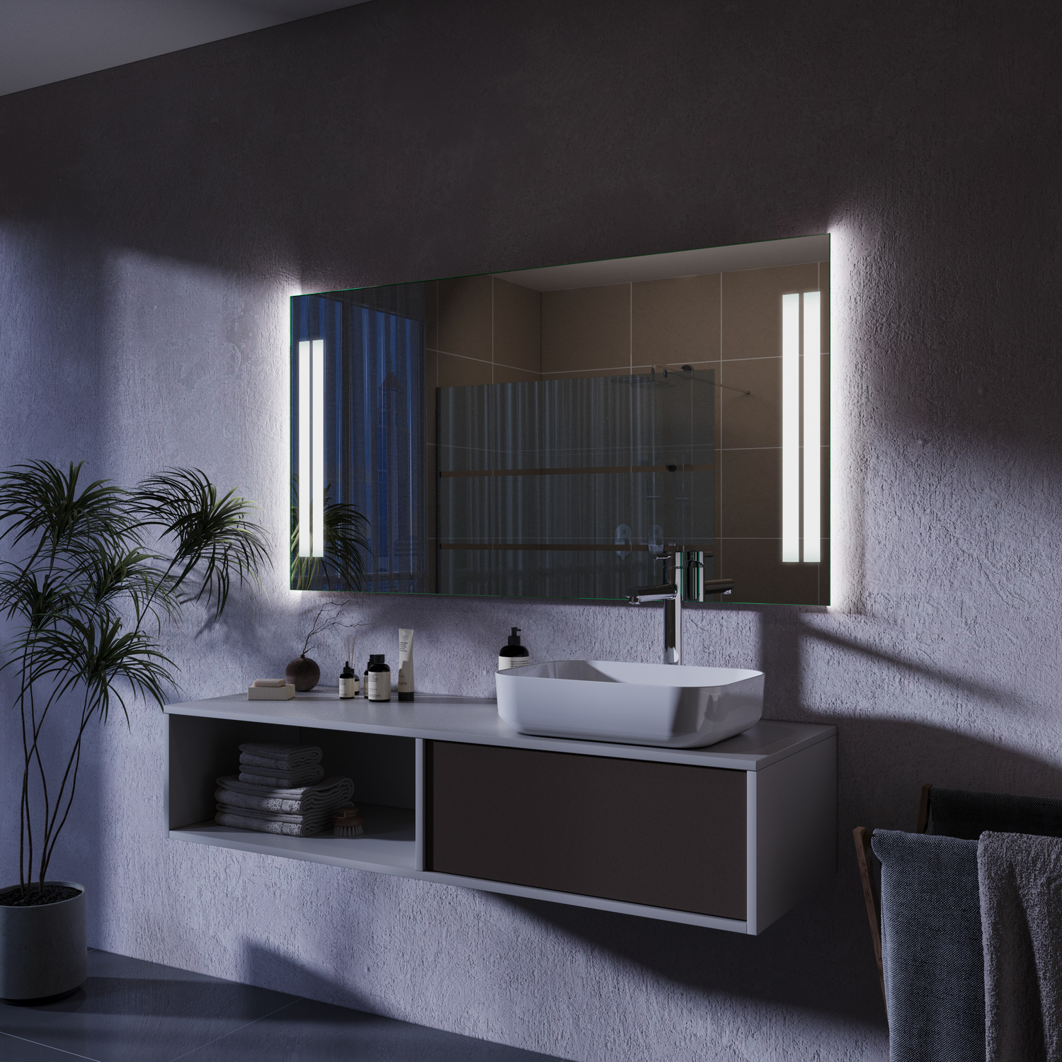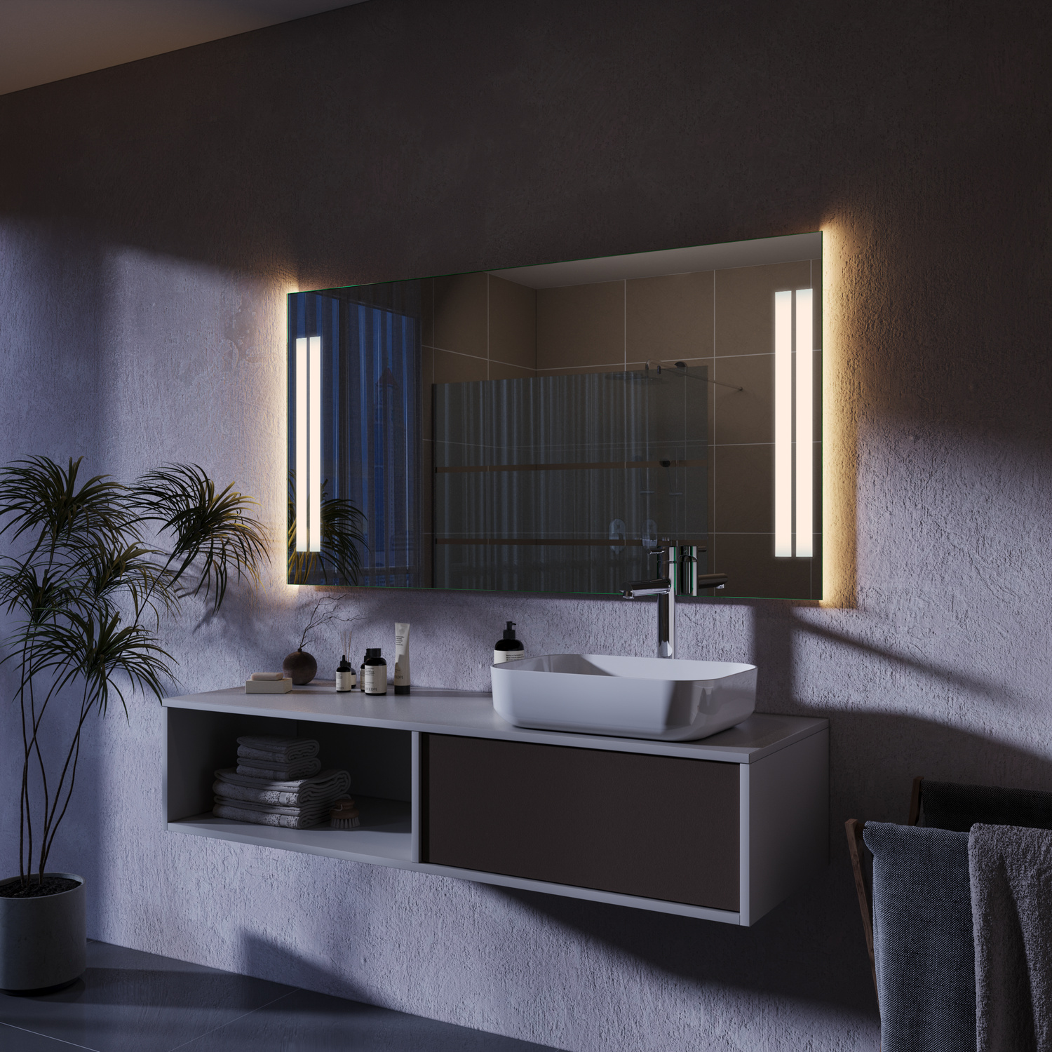 Der Badspiegel CALA MILLOR ist ein moderner LED-Spiegel mit seitlich angeordneten, satinierten Leuchtflächen. Die doppelte Lichtzone sorgt für eine gleichmäßige, angenehme Ausleuchtung und verleiht dem Badezimmer eine helle und ruhige Atmosphäre.