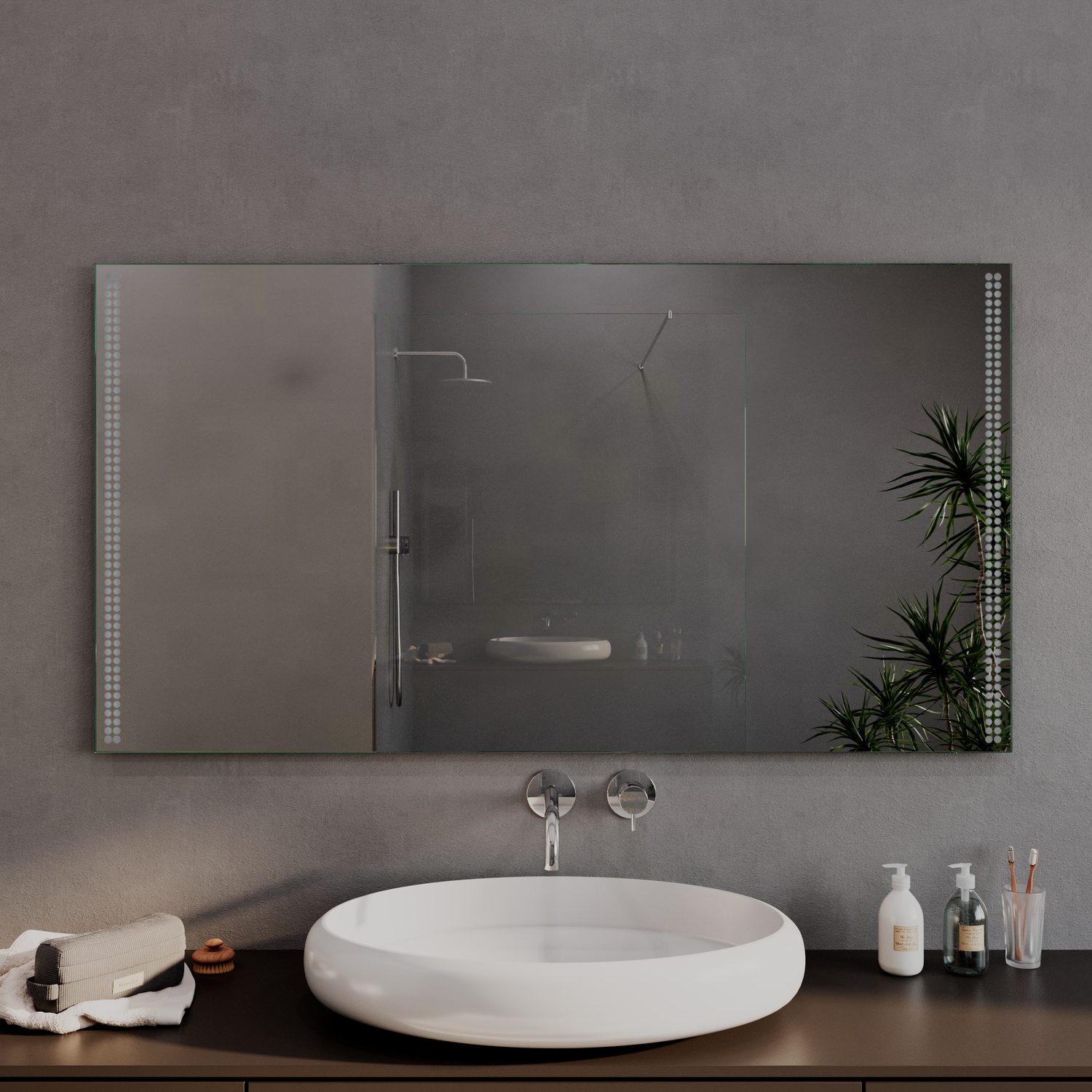 Die seitliche LED-Beleuchtung erzeugt eine gleichmäßige, blendfreie Ausleuchtung der Spiegelfläche. Dadurch eignet sich der Spiegel ideal für tägliche Anwendungen wie Rasur, Hautpflege oder Styling und unterstützt ein natürliches Lichtbild.