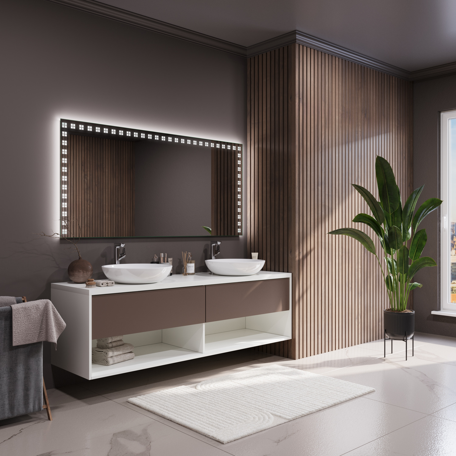 Die LED-Beleuchtung ist in verschiedenen Varianten erhältlich: warmweiß, neutralweiß, kaltweiß oder mit RGB-Farboptionen für eine atmosphärische Lichtinszenierung. So gestalten Sie Ihr Badezimmerlicht ganz nach Ihren persönlichen Vorlieben – funktional am Morgen, entspannend am Abend.