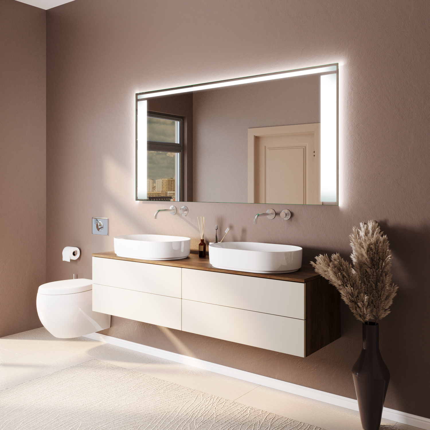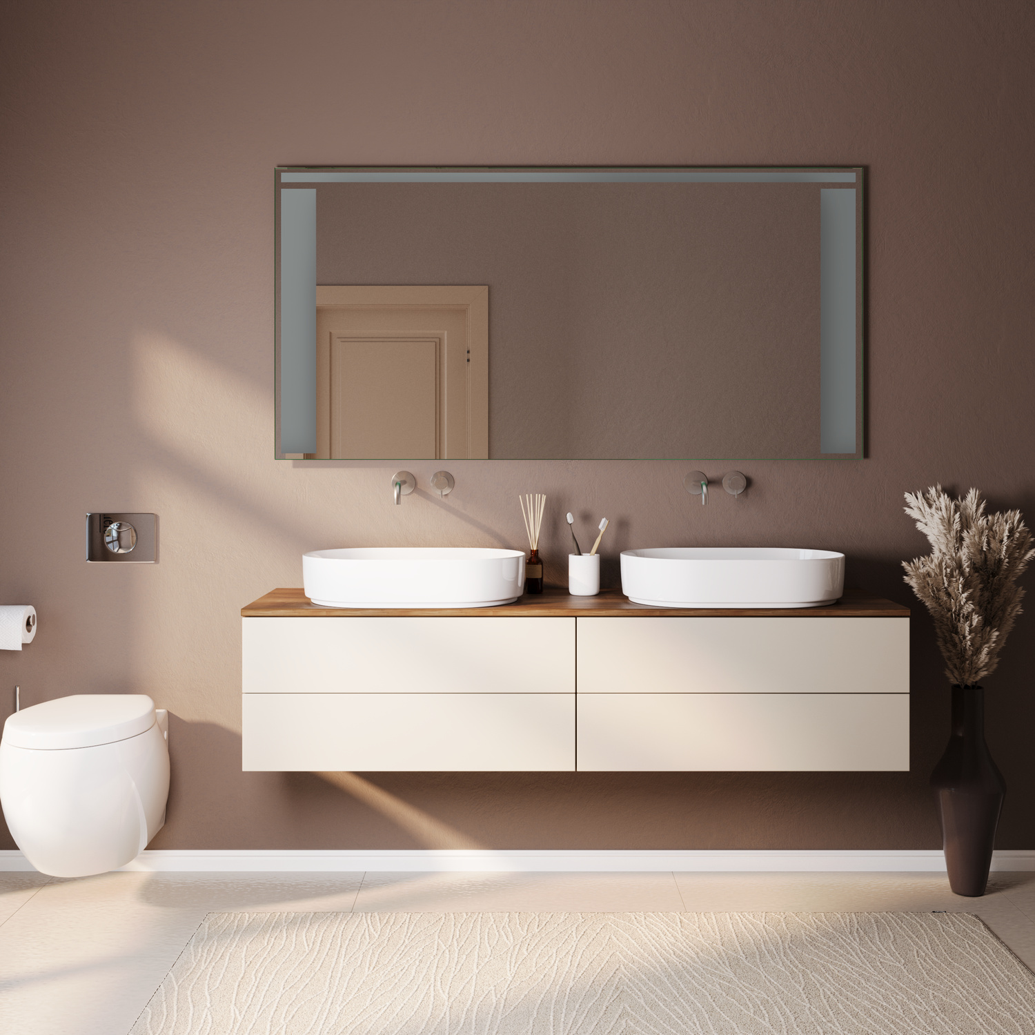 Erleben Sie mit dem Badspiegel LORENO mit LED-Beleuchtung die perfekte Verbindung aus modernem Design, exzellenter Verarbeitung und funktionaler Eleganz. Dieser hochwertige Spiegel mit LED-Beleuchtung an den Seiten und oben verleiht Ihrem Badezimmer eine warme, einladende Atmosphäre und setzt zugleich stilvolle Akzente. Mit seiner präzisen Linienführung und hochwertigen Materialien wird er zum Blickfang in jedem Badbereich.