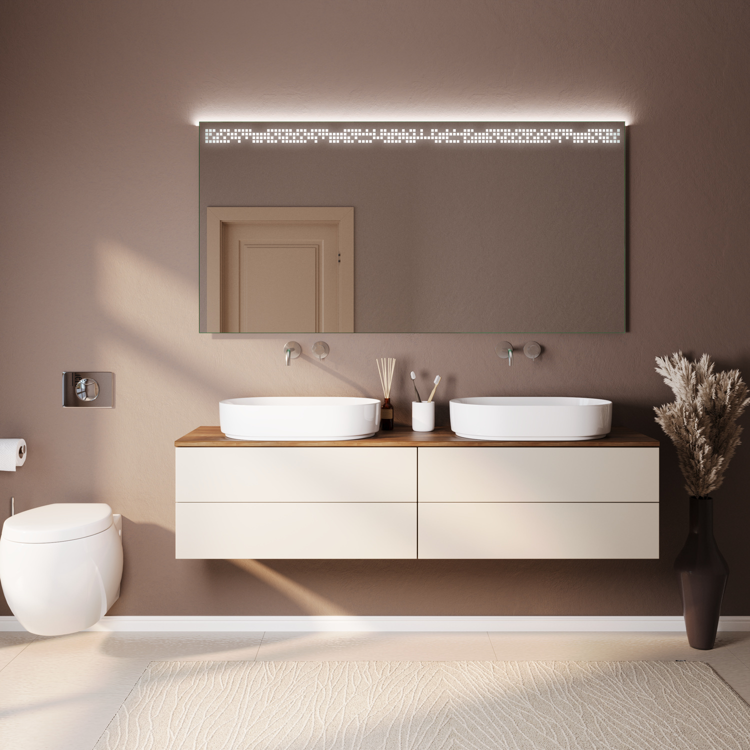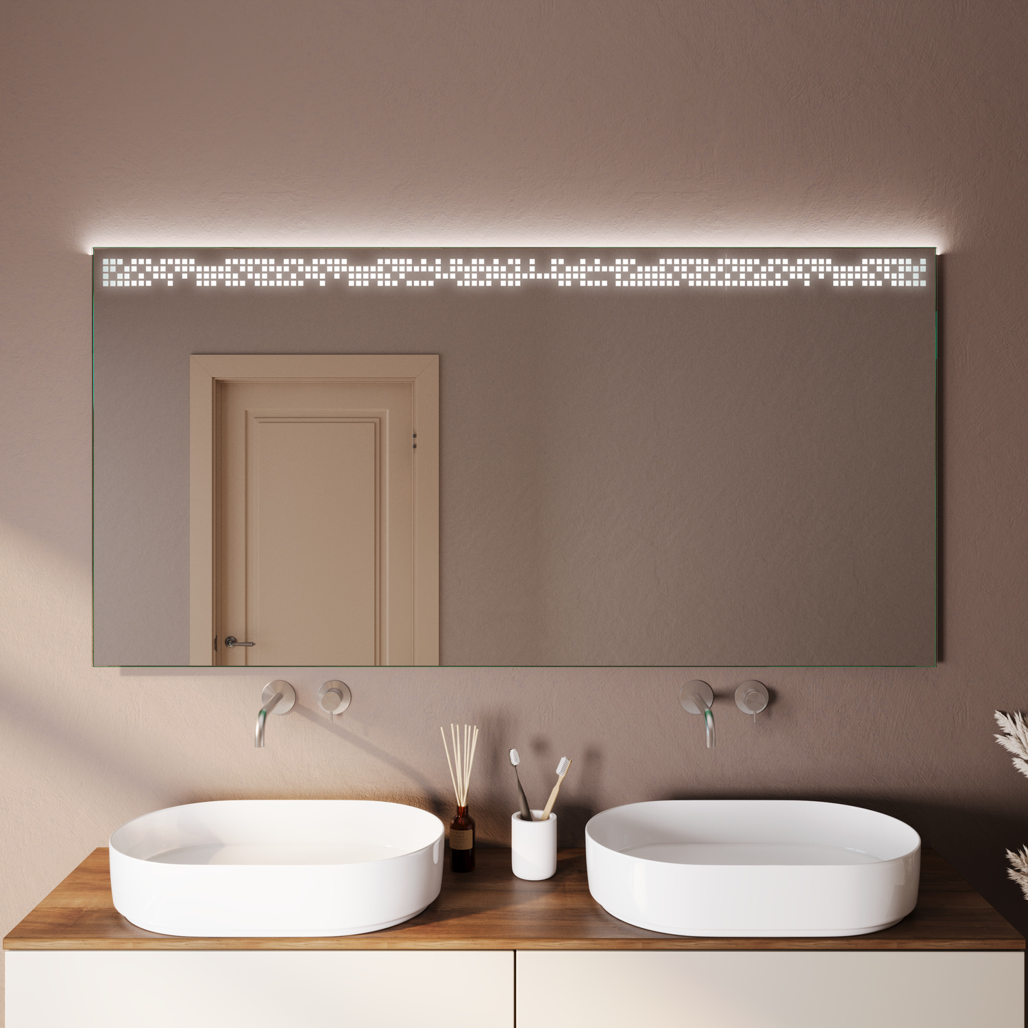 Der Badspiegel NANGIS steht für modernes, minimalistisches Design und eine klare Formensprache. Die LED-Beleuchtung im oberen Bereich sorgt für eine gleichmäßige, angenehme Ausleuchtung und schafft eine ruhige, stilvolle Atmosphäre im Badezimmer.