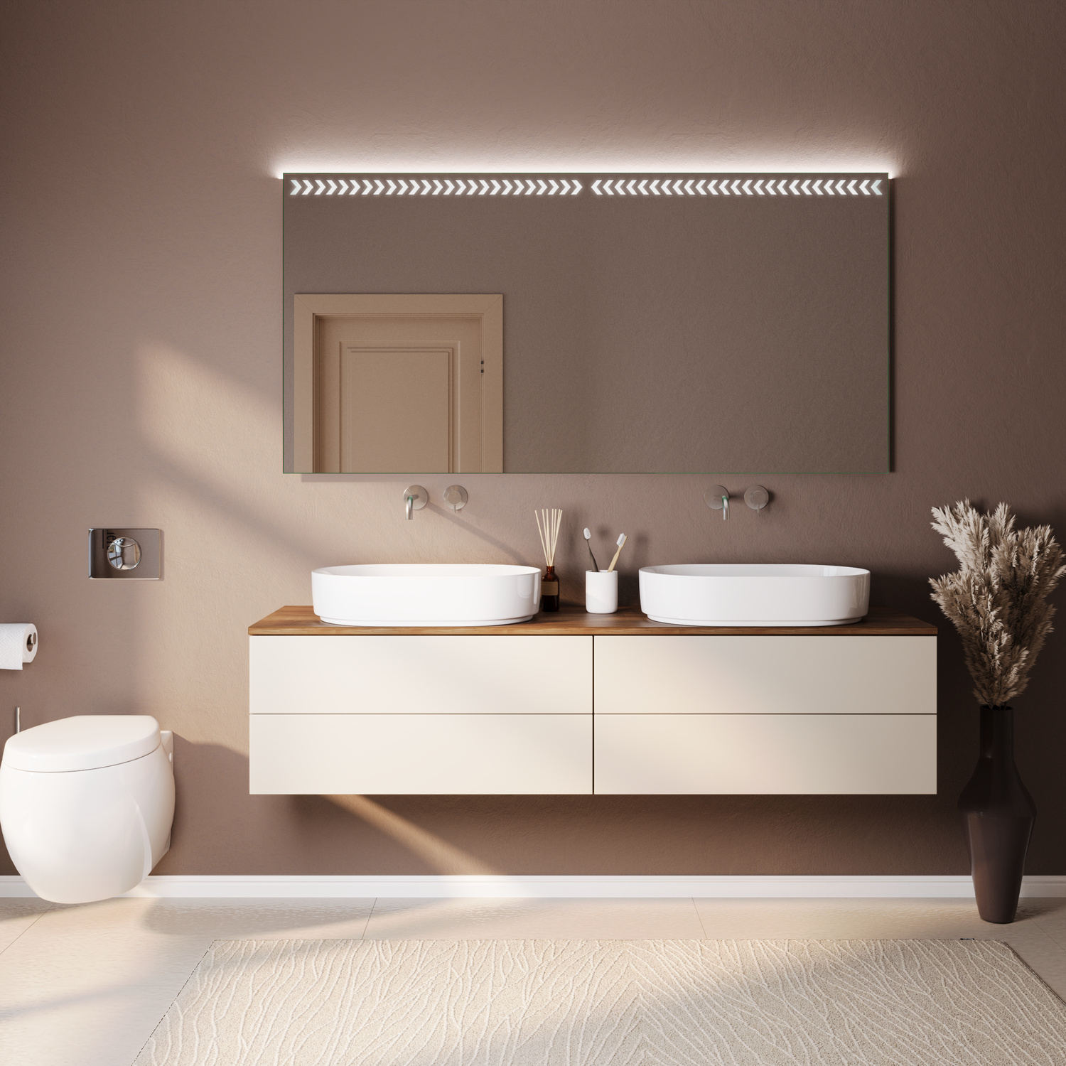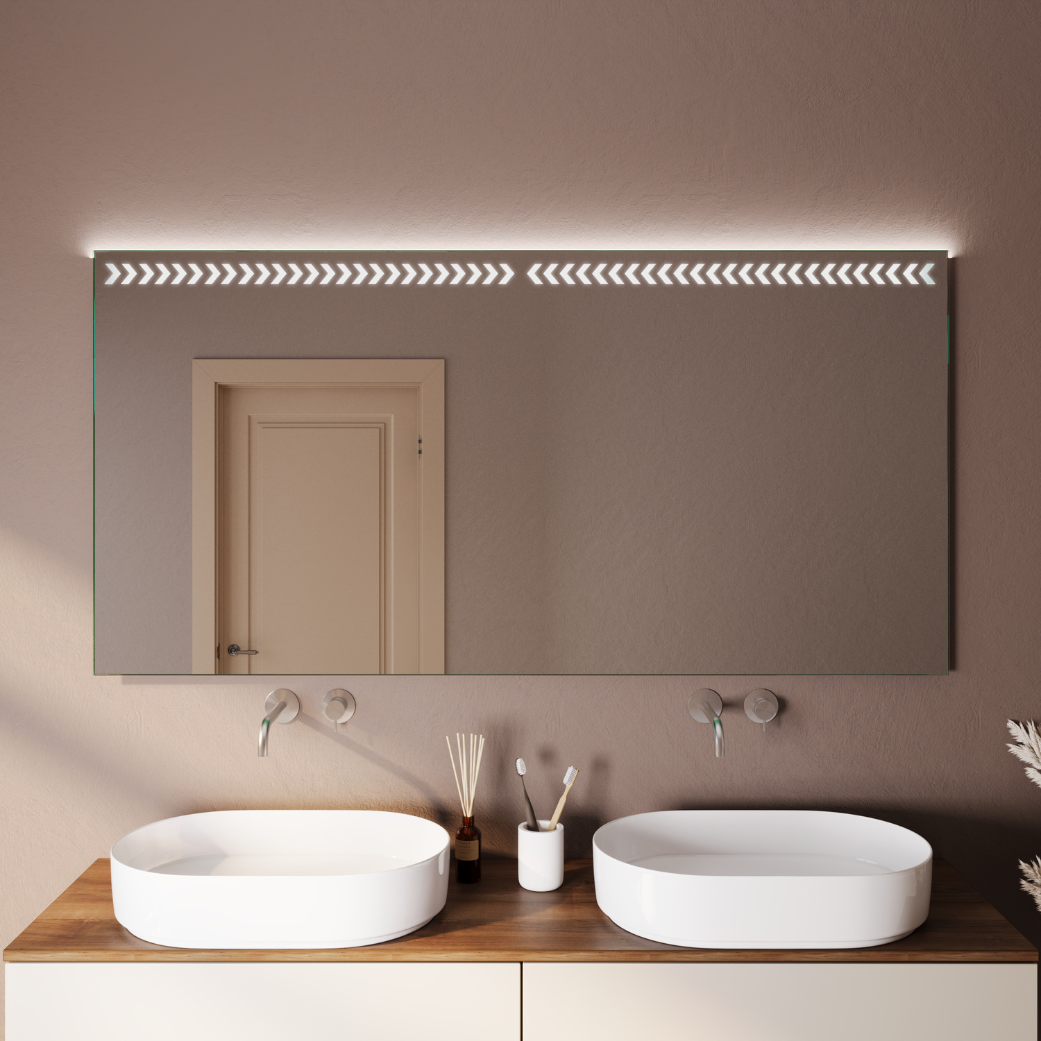 Die integrierte LED-Beleuchtung im oberen Bereich sorgt für eine gleichmäßige und angenehme Ausleuchtung. Sie eignet sich ideal für tägliche Anwendungen wie Rasieren, Schminken oder Styling und setzt gleichzeitig dezente Lichtakzente im Raum.
