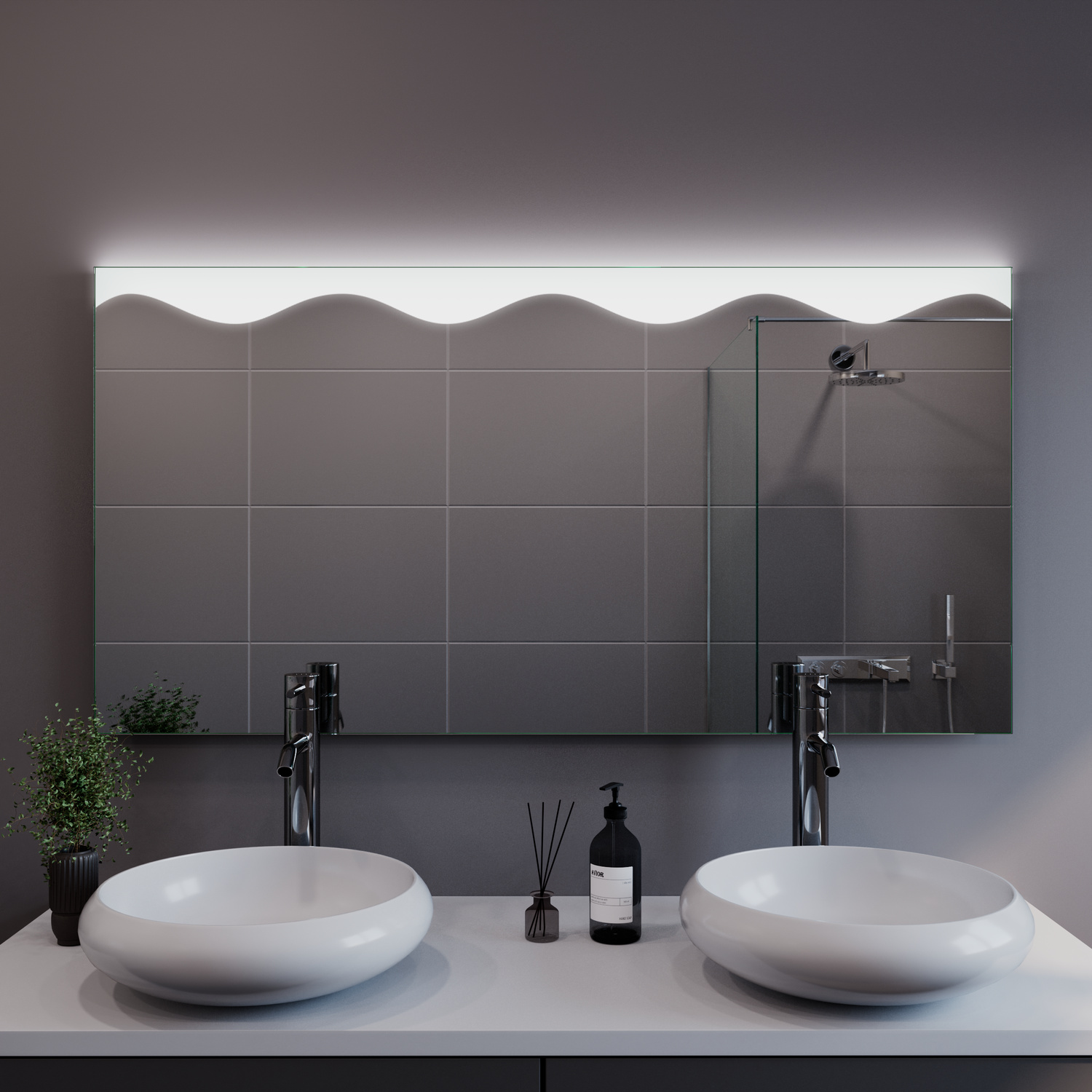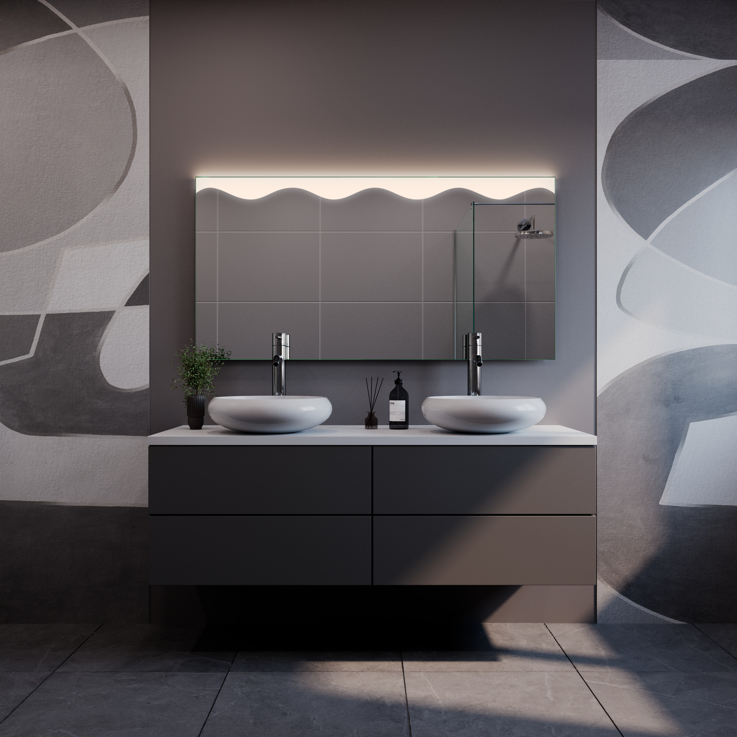 Der Badspiegel VANNES mit LED-Beleuchtung im oberen Bereich verbindet modernes Design mit klarer Linienführung. Die präzise Lichtführung sorgt für eine angenehme, ruhige Atmosphäre im Badezimmer.
